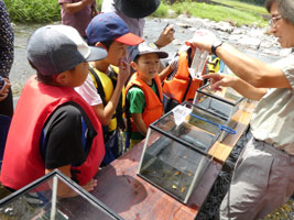 2時間ほどかけて川のいきもの探し。青木先生に川でのいきもの探しのコツを教えてもらいます。
