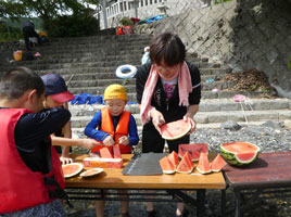 川で冷やしたスイカを食べた後は、笹船を作り、川での笹船競争。