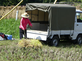 ガードレールをハサにして天日干し。脱穀。収穫量は9たい(30キロ×9袋)